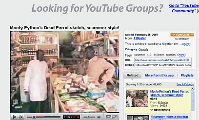 גולש שנמאס לו מה"עוקץ הניגרי", החליט להשפיל את הנוכלים בדרך מקורית במיוחד: הוא דרש מהם להצטלם כשהם מבצעים את מערכון התוכי המת של מונטי פייטון