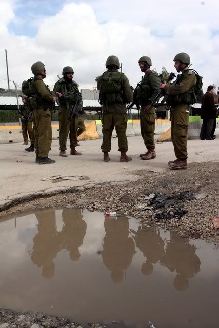epa00931823 Israeli soldiers take position during a Palestinian protest against the check points Bet Eba at a check point near the West Bank City of Nablus, on Wednesday, 14 February 2007. EPA/ALAA BADARNEH