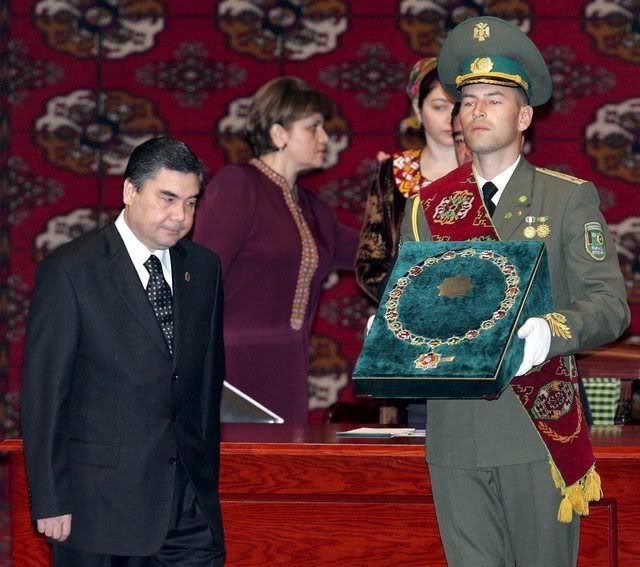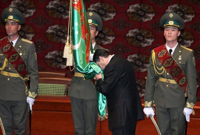 epa00931844 Turkmenistans new President Gurbanguly Berdymukhammedov kisses the national flag during an inauguration ceremony in Ashgabad, 14 February 2007. Regime loyalist Gurbanguly Berdymukhammedov was sworn in as Turkmenistans new president at a grand ceremony on Wednesday amid hopes for reform in this resourcerich Central Asian nation. EPA/OLEG PRASOLOV