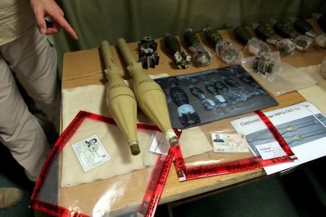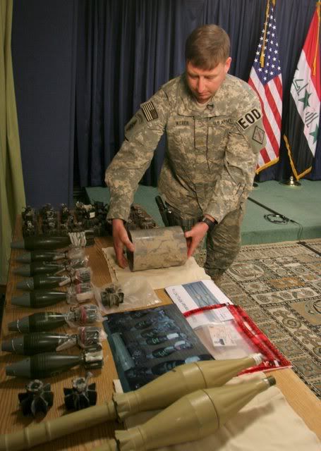 epa00932050 Chief U.S. military spokesman, Maj. Gen. William Caldwell, 2nd left, looks on as a U.S. Army officer holds a mortar round, a piece of evidence gathered by U.S. military on Irans support to militant Iraqis fighting American forces at a press conference in Baghdad, Iraq, Wednesday, 14 February 14, 2007. The Bush administration is struggling to explain what it knows about alleged Iranian interference in Iraq after Pentagons top general, Gen. Peter Pace, appeared to contradict a recently released military dossier on the subject. EPA/SAMIR MIZBAN / POOL