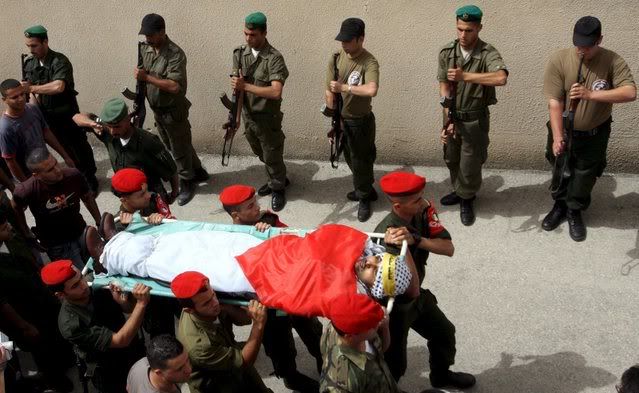 the body of Omar Abu Zafer during his funeral in the West Bank city of Tulkarem, 30 May 2007. Abu Zafer, 22, a member of the Fatah-linked armed group Al-Aqsa Martyrs Brigades, was killed when Israeli soldiers clashed with militants during an incursion at Ramallah, Palestinian sources said. Three other Palestinians were wounded in the clashes, while one was arrested. EPA/ALAA BADARNEH