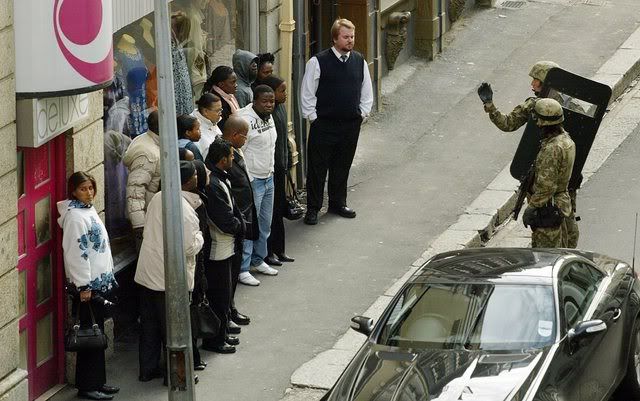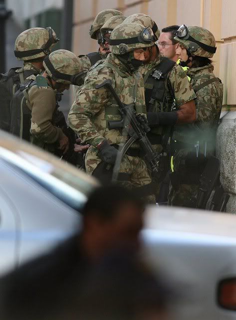 SOUTH AFRICA HOSTAGE -epa01034090 South African policemen evacuate people from a building near a restaurant in Long street where a gunman held hostages in central Cape Town South Africa 09 June 2007. The hostage taker was killed by the police after a stand off lasting seven hours. EPA/STR