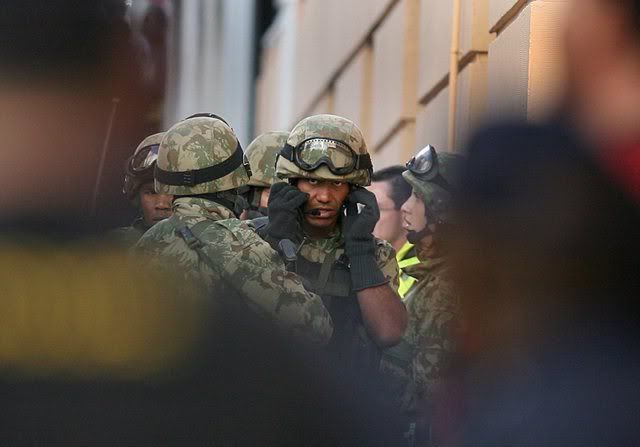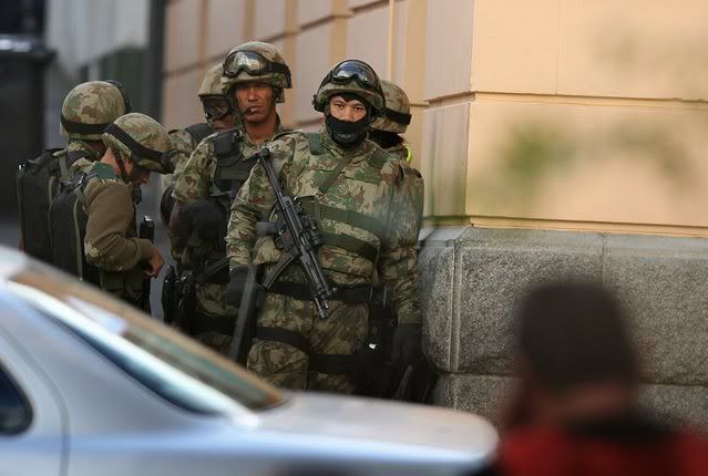 SOUTH AFRICA HOSTAGE -epa01033857 South African policemen take up position along Long street during a hostage stand-off in central Cape Town, South Africa 09 June 2007. A person was shot and injured during a hostage incident at a restaurant in Long Street, central Cape Town. Four hostages are being held in the restaurant as police negotiators are speaking to their captor. EPA/NIC BOTHMA