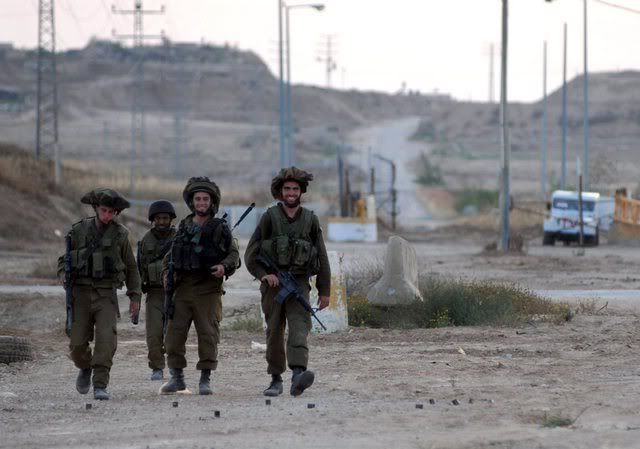 Israeli troops take position on a road near a gunbattle with Palestinian militants from Islamic Jihad at the Kissufim crossing, on the border between Israel and the Gaza Strip, Saturday, June 9.2007. Palestinian gunmen from Gaza broke through Israel's border fortifications on Saturday and battled Israeli troops near an army post inside Israel, the military said.Israeli Army Radio said troops killed one of the raiders but suffered no casualties themselves in the firefight