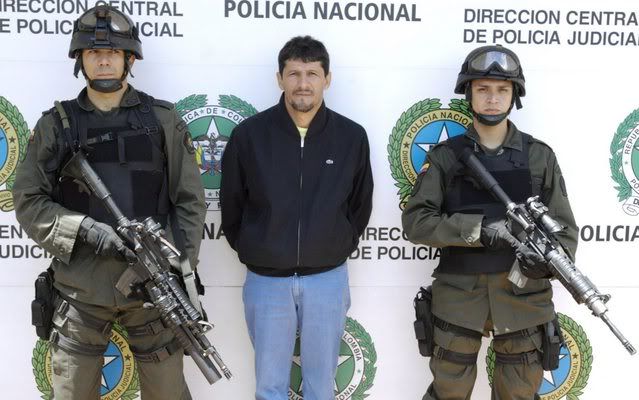 COLOMBIA EXTRADITION RAMIREZ DRUG-epa01034050 A handout picture shows members of Colombia's National Police parading Jose Gabriel Villanueva Ramirez (C), captured during a drug operation in Rionegro, Colombia, 09 June 2007. Ramirez is wanted in the U.S. on extradition charges. EPA/Policia Nacional / HO