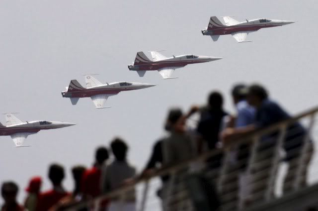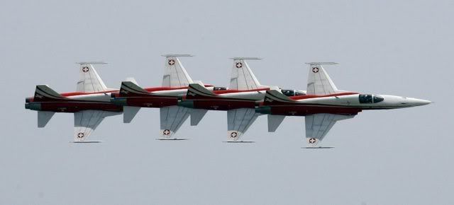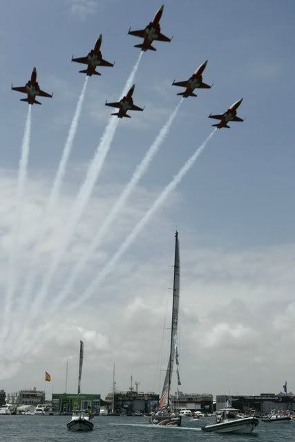 The patrouille suisse pass on the Swiss defender yacht Alinghi, SUI 100, before the first match race against New Zealand's challenger yacht Emirates Team New Zealand, NZL 92, during the first day of the 32nd America's Cup, in Valencia, eastern Spain, 23 June 2007. Emirates Team New Zealand will face in the best of nine series Swiss defender Alinghi for the America's Cup Trophy. EPA/LAURENT GILLIERON