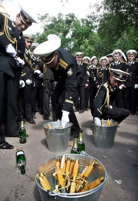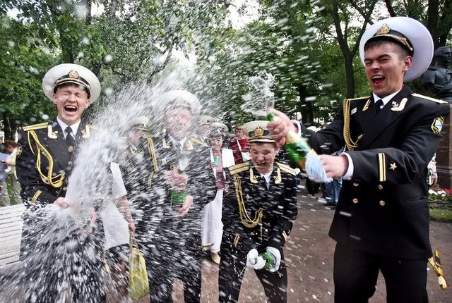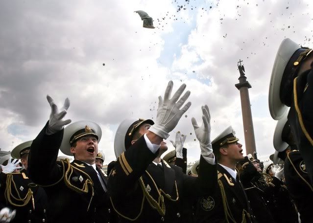 Cadets of the Russian Naval Institute throw coins in the air during a parade at Dvortsovaya Square in St. Petersburg 23 June 2007, as they mark the promotion to officers and the completion of the Institute. EPA/ANATOLY MALTSEV