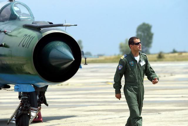 A Romanian military pilot leaves his Mig 21 Lancer parked on Mihail Kogalniceanu airbase's runway, 250 km eastern of Bucharest, Romania, 23 June 2007. Eighteen Romanian Mig 21 jets train with eleven Mirage 2000N during the joint flight exercise "Chasseur Accompli 2007" between 17-27 june 2007. EPA/RADU VIOREANU
