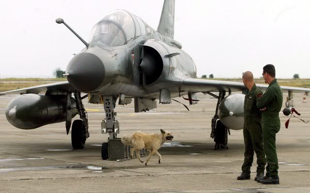 Two French jet pilots stand near a Mirage 2000N parked on Mihail Kogalniceanu airbase's runway, 250 km eastern of Bucharest, Romania, 23 June 2007. Eighteen Romanian Mig 21 jets train with eleven Mirage 2000N during the joint flight exercise "Chasseur Accompli 2007" between 17-27 june 2007. EPA/RADU VIOREANU