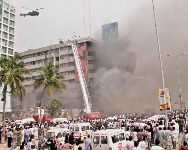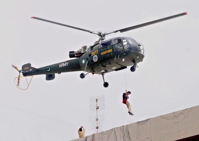 Pakistani Army helicopters rescue people after fire erupted in a shopping mall in Karachi Pakistan 23 June 2007. Eyewitnesses said that the fire was erupted due to electric short circuit in a cloth shop. EPA/NAEEM UL HAQ