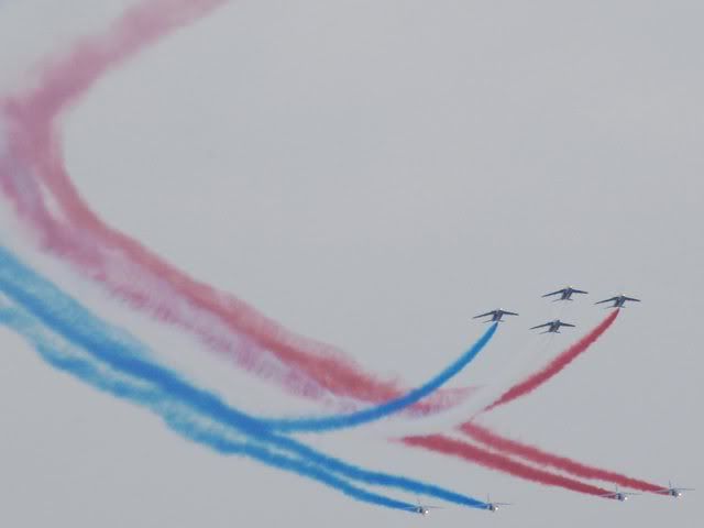 Picture made available on 03 November 2007 shows two Omani youngsters watching The Patrouille De France aerobatics Air team performs during their sky cicus shows at Al-Qurom beach in Muscat, Oman on 02 November 2007