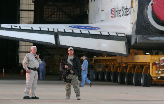 Space Shuttle Atlantis during rollover from the Orbiter Processing Facility(OPF) to the Vehicle Assembly Building(VAB) under the eyes of NASA security at Kennedy Space Center,Cape Canaveral, Florida, USA, 03 November 2007.Atlantis is moving to the VAB where it will be mated to the External Tank and Solid Rocket Boosters in preparation for launch on STS-122, scheduled for no earlier than 06 December 2007