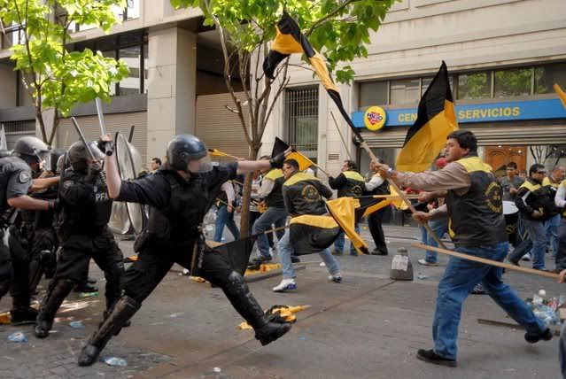Demonstrators clash with police during a transport workers rally to reject the new traffic laws, in front of the Argentinian Legislature, Buenos Aires, Argentina, 12 November 2007. Police uses rubber bullets and canes to discourage the demonstrators as they respond with fists and sticks, leaving at least 15 wounded people