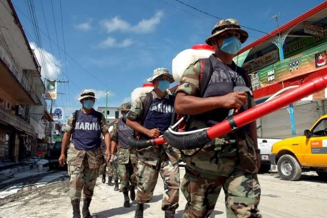 Mexican Navy sailors clean up the streets of Villahermosa in the aftermath of floods in Tabasco State, Mexico,12 November 2007. Mexico's President Felipe Calderon (not pictured), visited houses affected by floodings in neighborhoods where he commanded the first evaluation committee and gave precise instructions to the social government cabinet, that the priority must be the attention to the affected people