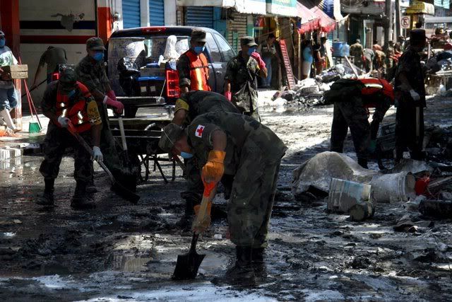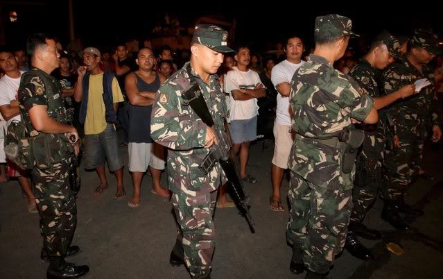 Philippine military troops guard the perimeter of the Philippine Congress building from onlookers following an explosion at the building's south wing entrance in Metro Manila's Quezon City, Philippines 13 November 2007. The explosion killed one and injured at least a dozen civilians including three congressmen, according to initial reports. House of Representatives Speaker Jose De Venecia said police told him that the blast was caused by a bomb, as authorities continue to investigate the incident