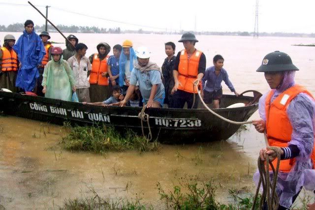 Soldiers lead families in a boat to safety after they were stranded by flooding in the central city of Danang, Vietnam, 13 November, 2007. New floods triggered by heavy rains in central Vietnam have claimed 11 more deaths and paralyzed traffic, trapping thousands of tourists in popular resort areas, officials and local media reported Tuesday. The remnants of Typhoon Peipah, which had weakened to a tropical depression, dumped heavy rains onto already flooded areas of the centre of Vietnam