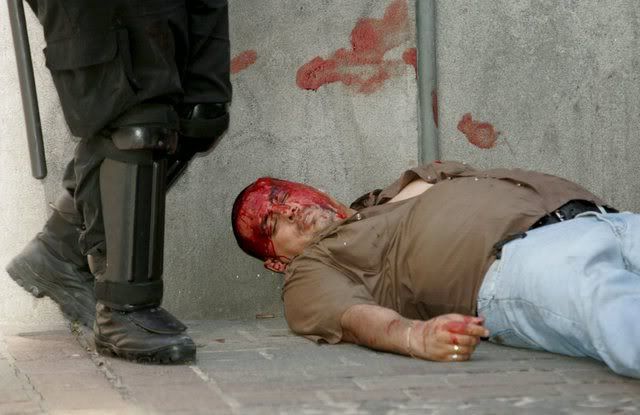 A picture made available on 13 November 2007 shows a wounded man laying on the floor next to the boots of a police officer in front of the parliament building in Buenos Aires, Argentina on 12 November 2007, after clashes between the police and taxi, buses and truck drivers who protested the new traffic law