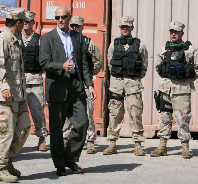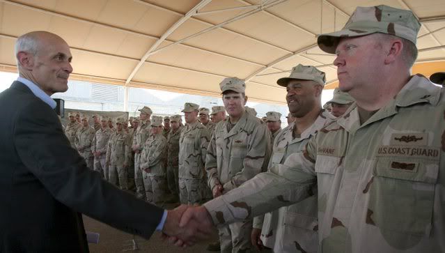 Secretary of the US Department of Homeland Security, Michael Chertoff (C) poses with Coast Guard service members at their training facility in Manama 13 November 2007. Chertoff's visit was the last leg of a tour that took him to Jordan and later Iraq where he lead the oath of allegiance for 178 foreign-born service members on 11 November 2007 during the largest naturalization ceremony there which coincided with Veterans Day. According to officials the secretary tour came about to thank service members and US allies for their continued support to coalition efforts in the region