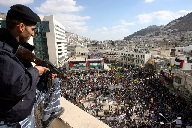 Palestinian policeman watch Fatah movement supporters during a rally to mark the third anniversary of late leader Yasser Arafat's death in the West Bank city of Nablus , 13 November 2007.Hamas security forces moved swiftly against their Fatah rivals in the aftermath of a mass Fatah rally that ended with seven people dead, rounding up 400 people in an overnight crackdown, Fatah officials said