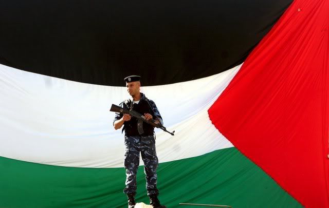 A Palestinian policeman stands guard in front of a huge Palestinian flag as he monitors a rally to mark the third anniversary of late leader Yasser Arafat's death in the West Bank city of Nablus, 13 November 2007. Hamas security forces moved swiftly against their Fatah rivals in the aftermath of a mass Fatah rally that ended with seven people dead, rounding up 400 people in an overnight crackdown, Fatah officials said.