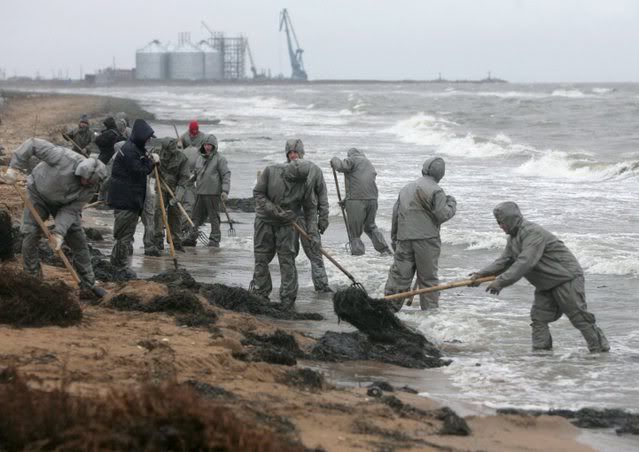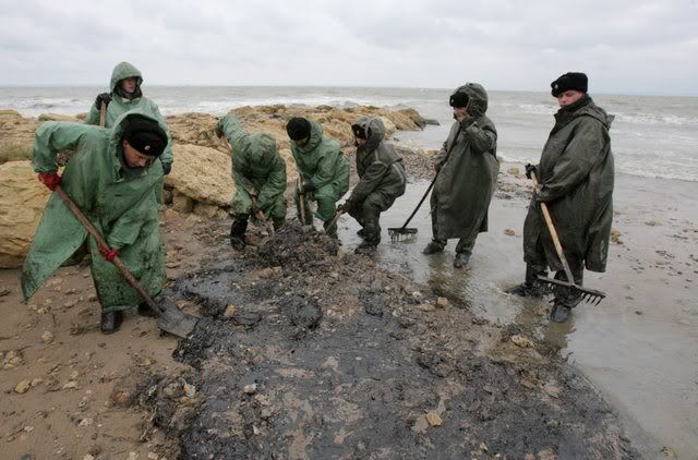 Russian military sailors and Russian Emergency Ministry servicemen collect the oil on the Black Sea shore near the village of Taman in the Kerch Strait, Krasnodar region, 13 November 2007. A Russian tanker carrying four thousand tonnes of fuel oil broke into parts in the Kerch Strait during a powerful storm 11 November. Two thousand tonnes of fuel oil leakage into the Black Sea and caused the death of 30 thousand birds