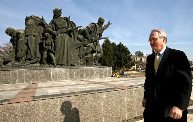U.S. Assistant Secretary of State Christopher Hill passes the monument of fallen heroes in Skopje, where he was ambassador during Kosovo crisis, 13 November 2007. Christopher Hill is in Macedonia to be awarded with highest 08th September State Medal by President of Macedonia, Branko Crvenkovski. Hill was awarded for his exeptional contribution for developing bilateral relationship between USA and Macedonia during his mandate as a first US ambasador in independent Maceonia (1996-1999).