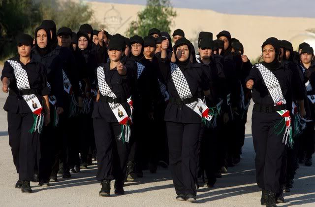 Palestinian policewomen march in formation during an exercise in their training facility in Jericho, on the West Bank, on 13 November 2007. Javier Solana, the EU Foreign Policy chief, toured the area and met with EU COPPS from countries such as Spain, Poland and the UK who are training the Palestinian Authority police force. The visit comes a day after Hamas gunmen in the Gaza Strip killed some 7 members of the mainstream Fatah movement who turned out at a huge rally marking the 3rd anniversary of the death of former Palestinian President Yasser Arafat
