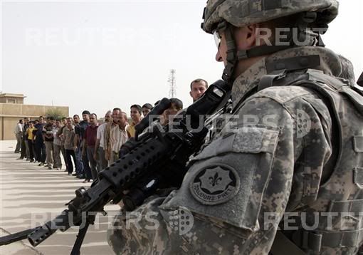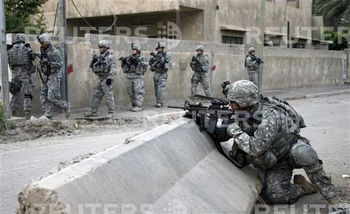 A U.S. soldier with 2nd Platoon, G Company, 3rd Squadron, 2nd Stryker Cavalry Regiment takes position during a patrol in the Muhalla 832 Mechanik neighbourhood in Baghdad November 12, 2007