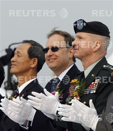 (L-R) South Korean Defence Minister Kim Jang-soo, the U.S. ambassador to South Korea Alexander Vershbow and Commander of U.S. Forces Korea (USFK) General B.B. Bell participate in the groundbreaking ceremony for the relocation of the USFK base to Pyeongtaek, about 70 km (44 miles) south of Seoul November 13, 2007. South Korea and the United States have agreed to relocate the main U.S. base now in Seoul and several others across the country to Pyeongtaek