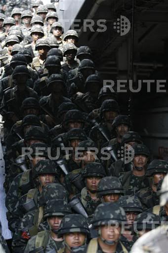 Two hundred troops from the Marine Batallion Landing Team 10 prepare to disembark at the Navy headquarters in Manila September 11, 2007 after more than nine years of fighting insurgents in Mindanao and Palawan. Philippine troops have arrested three Islamic militants on the resort island of Palawan and a spokesman said on Monday that they had been part of a cell plotting kidnappings and bombings in tourist areas .