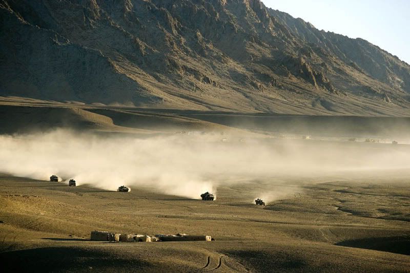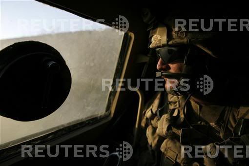 Canadian Warrant Officer Yves Gonneville from the NATO-led coalition looks out the rear window from the lead vehicle of a convoy, patrolling along a route frequently used by Taliban insurgents for ambushes and roadside bombs, near Panjwaii town in Kandahar province, southern Afghanistan November 13, 2007