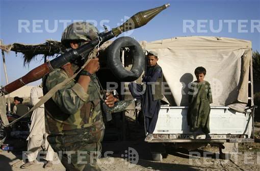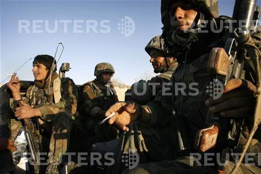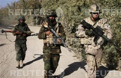 Afghan National Army troops march alongside a Canadian soldier (R) from the NATO-led coalition during a patrol along a route frequently used by Taliban insurgents for ambushes and roadside bombs near Panjwaii town in Kandahar province, southern Afghanistan, November 13, 2007. In addition to fighting the Taliban themselves, Canadian troops are heavily involved in training Afghan army and police forces to eventually take responsibility for national security