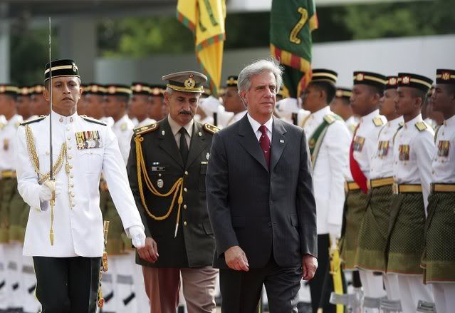 Uruguay President Tabare Vazquez Rosas (R) inspects a Guard of Honour during a welcoming ceremony at the parliament square in Kuala Lumpur, Malaysia, 15 November 2007. Vazquez Rosas is in Malaysia for an official visit that began late 14 November