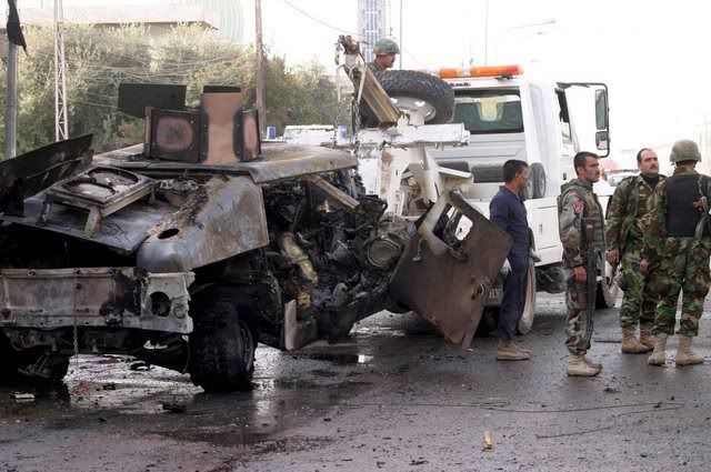 Iraqi policemen stand next a destroyed police armoured vehicle at the site of a bomb attack in Kirkuk north of Baghdad, Iraq on 15 November, 2007. A car bomb targeting a convoy of a police colonel, killed six people and wounded 25 others