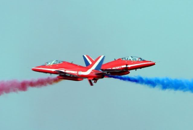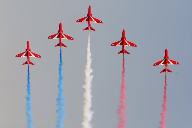 The British Royal Air Force Aerobatic Team, The Red Arrows performs during the last day of Dubai Air Show 2007 at Dubai Airport, 15 November 2007. Dubai Airshow 2007 ended its record-breaking run with Emirates, the international airline of the UAE, placing one of the world's largest ever orders for a Cabin Service Trainer (CST) installation.