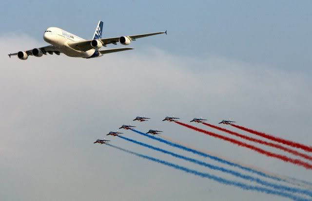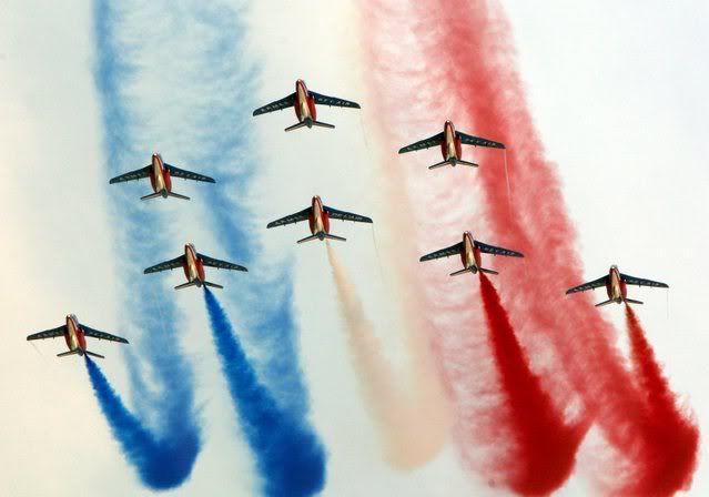 The team of Patrouille De France performs during the last day of Dubai Air Show 2007 at Dubai Airport, 15 November 2007. Dubai Airshow 2007 ended its record-breaking run with Emirates, the international airline of the UAE, placing one of the world's largest ever orders for a Cabin Service Trainer (CST) installation