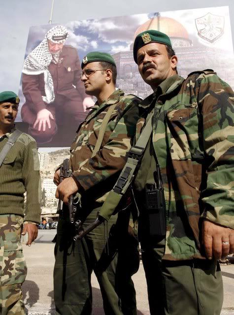 Palestinian policemen watch a rally marking the 19th anniversary of the Palestinian declaration of independence in the West Bank town of Nablus, 15 November 2007. Deceased PLO leader Yasser Arafat declared in 1988 the 15th November as Palestinian Independence day. Since 1994, the autonomous Palestinian Authority has exercised various degrees of control in large parts of the territories, pursuant to the Oslo Accords