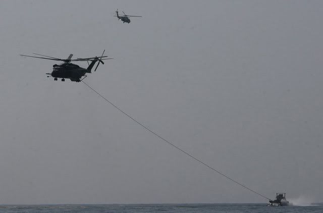 A MH-53E helicopter tows an MK-105 Magnetic Influence Minesweeping System during mine counter measure exercises in the Persian Gulf, 15 November 2007. The US Navy conducted a mine countermeasures exercise in the southern part of the Gulf to demonstrate its ability to counter potential mine-laying and to maintain open sea lanes and anchorages in the region since 12 November 2007. The exercise is the sixth of its kind to be carried out by the US Navy in the region in 2007