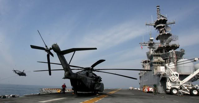 PACIFIC OCEAN (Nov. 13, 2007) CH-46E Sea Knight helicopters fire chaff flares during an air power demonstration for Sailors, Marines and their friends and family aboard USS Bonhomme Richard (LHD 6). The ship is conducting a Tiger Cruise from Hawaii to its homeport of San Diego, and the friends and family of Sailors aboard will stay with the ship until its return home. The multi-purpose amphibious assault ship and Bonhomme Richard Expeditionary Strike Group are underway for a regularly scheduled western Pacific deployment. U.S. Navy photo by Mass Communication Specialist 3rd Class Robert C. Long