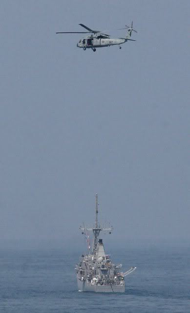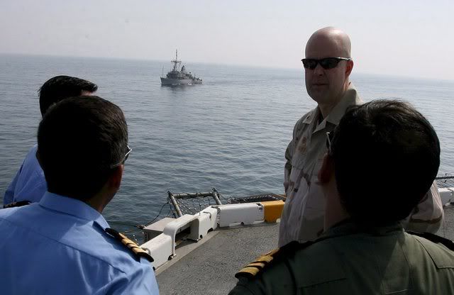 US Navy Mine Counter Measures Division commander Scott Davies, (2-R) speaks to Pakistani Navy officers on board the US Navy amphibious assault ship 'WASP' with mine hunting ship USS Gladiator (MCM 11) seen in background during mine counter measure exercises in the Persian Gulf, 15 November 2007. The US Navy conducted a mine countermeasures exercise in the southern part of the Gulf to demonstrate its ability to counter potential mine-laying and to maintain open sea lanes and anchorages in the region since 12 November 2007. The exercise is the sixth of its kind to be carried out by the US Navy in the region in 2007