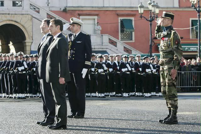 Italian Prime Minister Romano Prodi (L) and French President Nicolas Sarkozy (2nd L) during the playing of national anthems before the traditional Italy-France summit on the issue of energy cooperation, Palais Sarde, in Nice, France, 30 November 2007