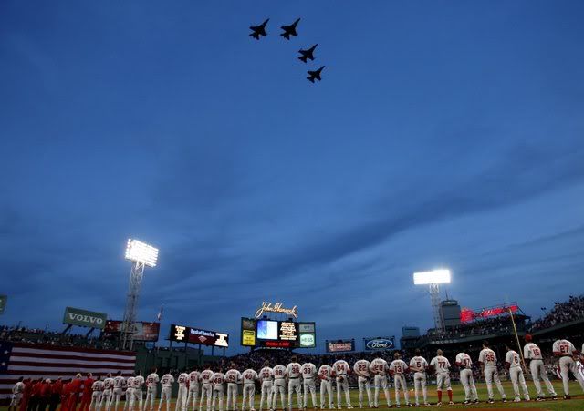 A quartet of F-16 jets performs a flyover prior to the start of game one of the American League Division Series between the Boston Red Sox and the Los Angeles Angels of Anaheim at Fenway Park in Boston, Massachusetts, USA, 03 October 2007