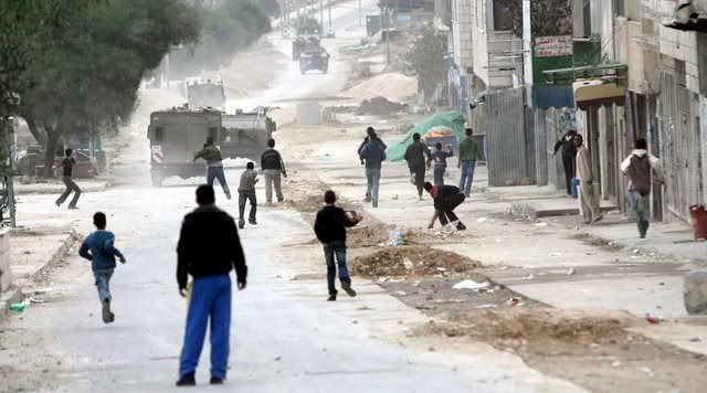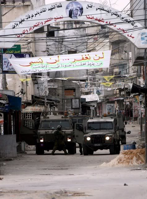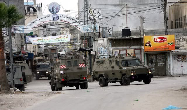 Israeli military jeeps file into Balata Refugee camp in the West Bank city of Nablus, 30 November 2007, during an Israeli operation.