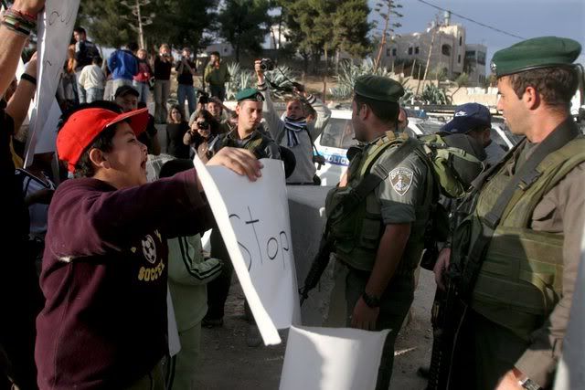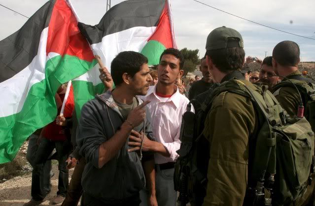 Israeli soldiers argue with Palestinian peace activists at a protest against the construction of the controversial Israeli separation barrier in the village of Maasarah close to the West Bank town of Bethlehem, 30 November 2007. The barrier is a combination of concrete walls and wire fences running more than 650 kms (400 miles) north to south that Israel says is necessary to protect itself from Palestinian militants. However, large sections of it encroach on the West Bank and the Palestinians call it a land grab