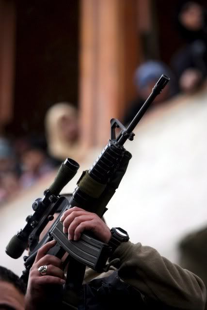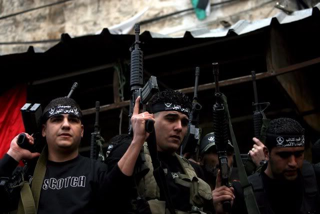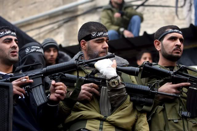 Palestinian gunmen hold up their guns during a rally for Al-aqsa brigade in the West Bank city of Nablus, 30 November 2007