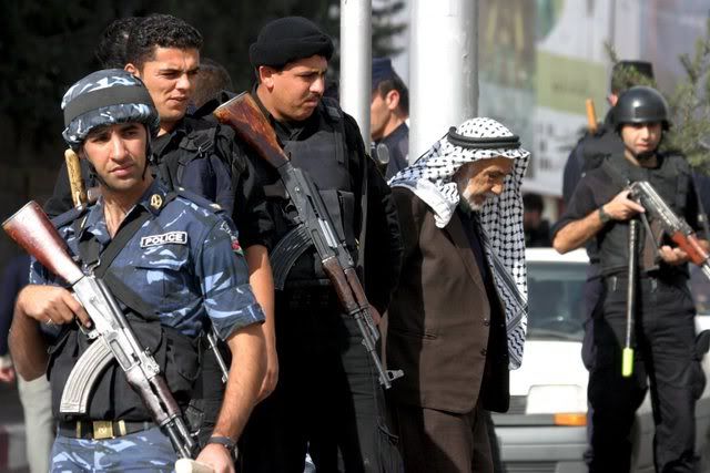Members of the Palestinian security forces, who are loyal to President Mahmoud Abbas, patrol after Friday prayers at the main street in the West Bank city of Hebron 30 November 2007