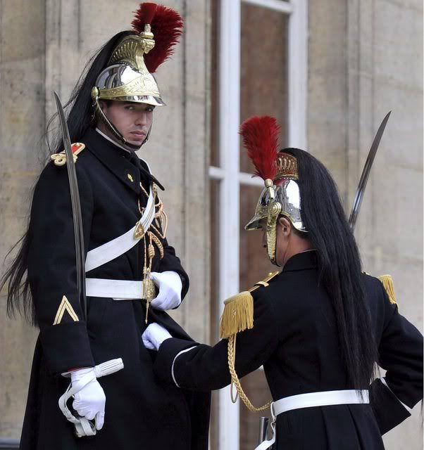 A Presidential Guard Horseman looks on while his superior straightens up his overcoat before the arrival the President of Mali Amadou Toumani Toureof to meet with French President Nicolas Sarkozy at Elysee Palace, in Paris, France, 26 October 2007