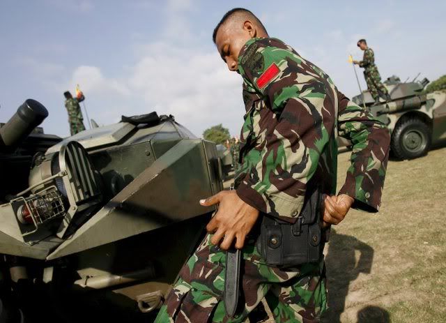 Indonesian soldiers line up during a security preparation in Denpasar, Bali, Indonesia on 30 November 2007. Bali will host the United Nations Climate change conference in December 2007, attended by around 10,000 representatives from 180 countries with the aim to reach a global consensus on global warming