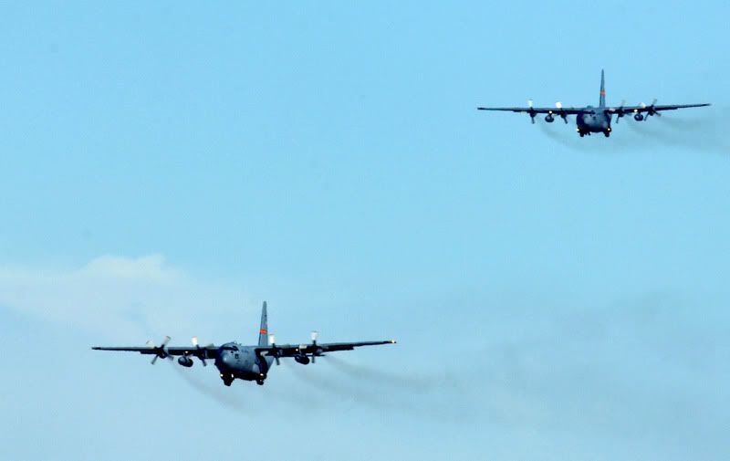 Two C-130 Hercules aircraft prepare to land at Nellis Air Force Base, Nev., after completing airdrop missions for a mobility exercise over the Keno range in Nevada. (U.S. Air Force photo/Staff Sgt. Scottie McCord)