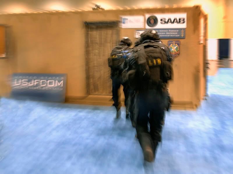 A Swedish special weapons and tactics team rushes into a simulated hostage rescue situation Nov. 27 during the Interservice/Industry Training, Simulation and Education Conference in Orlando, Fla. (U.S. Air Force photo/Tech. Sgt. Larry A. Simmons)